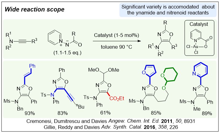 Intermolecular and selective synthesis of 2,4,5-trisubstituted oxazoles by a gold-catalysed formal [3+2] cycloaddition; P. W. Davies,* A. Cremonesi, L. Dumitrescu, Angew. Chem. Int. Ed. 2011, 38, 8931-8935.